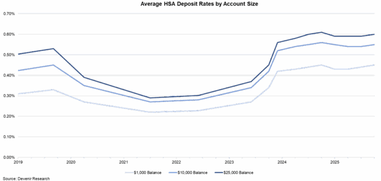 Over the last quarter, data collected from HSA Search showed HSA deposit rates increased from their previous levels. All three balance thresholds ticked up 0.01%. The $1,000 balance moved from 0.44% to 0.45%, the $10,000 balance ticked up from 0.54% to 0.55%, and the $25,000 balance went from 0.59% to 0.60%. Rates still appear to be relatively stable with a small increase or decrease of 0.01%-0.02% over the last year.