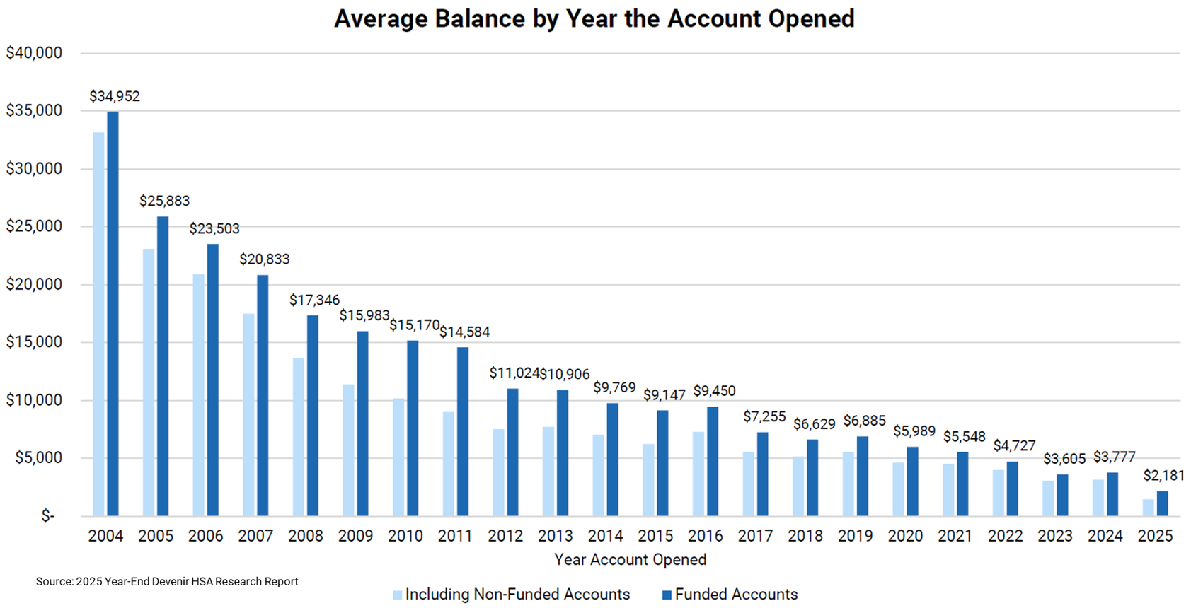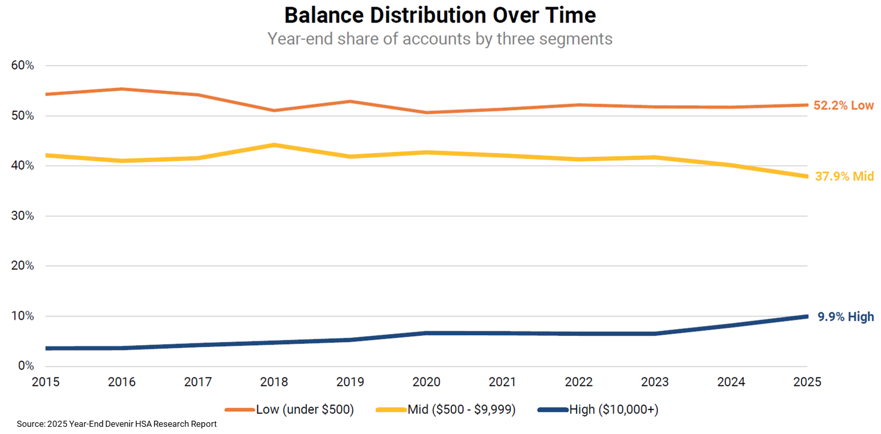 - Higher-balance HSAs continued to gain share. The number of accounts with at least $10,000 reached 4.1 million by year-end 2025, while 1.7 million accounts held more than $25,000.